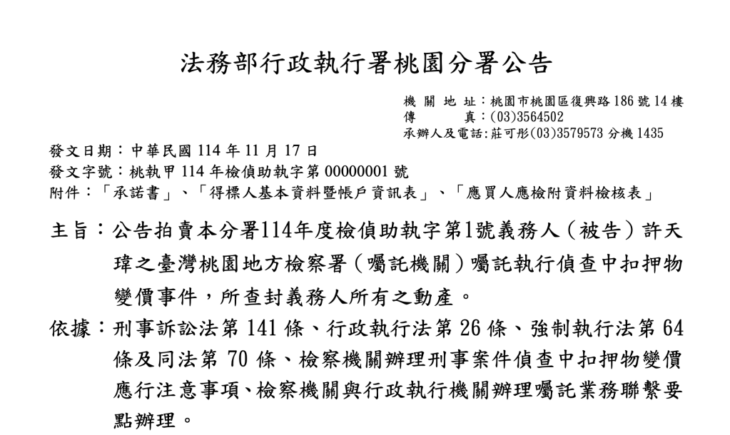 [4] 法務部行政執行署桃園分署民國114 年11 月17 日桃執甲114 年檢偵助執字第 00000001 號公告:https://www.tpkonsale.moj.gov.tw/Detail/Chattel?NO=78ea127e-a6ba-4feb-ac38-96c26291b1e2