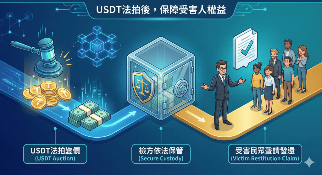 若本案確實涉及詐欺或洗錢犯罪,即使 USDT 已經經過法拍而變價為新臺幣,受害人仍可依《刑事訴訟法》第 473 條第 1 項,於刑事裁判確定後一年內,向檢察官聲請發還(拿回新臺幣)。各地檢署亦常備有聲請書狀範本(如苗栗地檢署),協助民眾提出聲請。因此,並不存在該則貼文聲稱的「受害民眾一顆都拿不到」、「在制度上已經無法被還原到任何受害者手中」等情形。